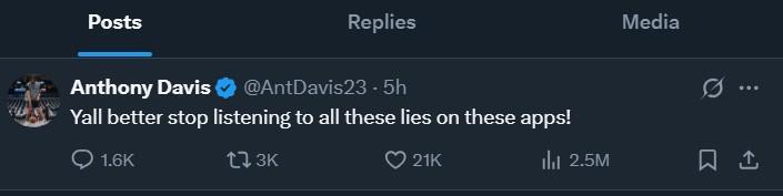 在消息发出后,浓眉第一时间更新个人社媒,他疑似驳斥了Shams的报道:“你们最好别再听信这些应用上的谣言了!”