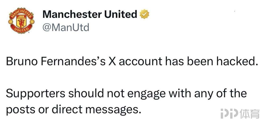 曼联社媒随后发布公告,表示:“布鲁诺-费尔南德斯的社媒账号遭到入侵。提醒球迷不要点击、回复或参与任何相关帖子及私信。”